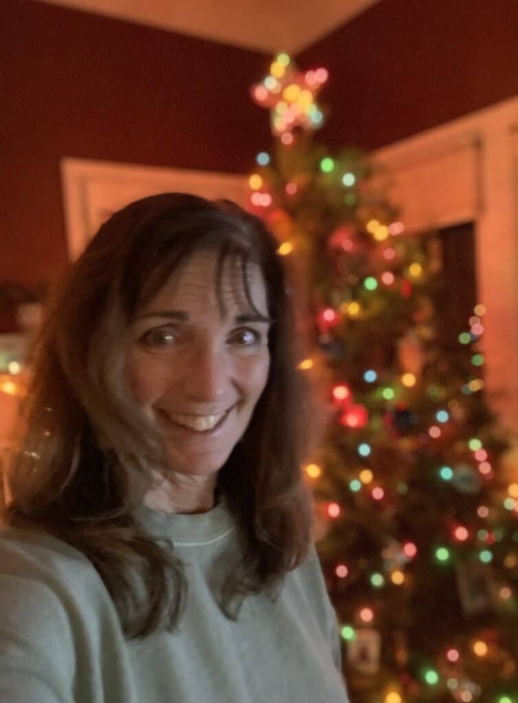Let’s consider the outcome if I were to take a picture of my Christmas tree lit inside my house at night using just my mobile phone in existing light. The result is a photo that is grainy and dark, blurry, and often with an odd, overly orange color cast. The hastily taken selfie of me below from a few years ago is a perfect example of this. In a word, not good.